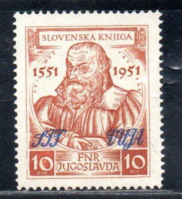 Yugoslav Postage Stamp in Changed Color Overprinted "STT VUJA"  In Zone B, stamps inscribed "STT VUJA" ("Free territory of Trieste, Military Administration of the Yugoslav Army") were issued.