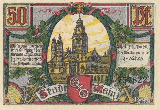 Following on from post number 3 on page 1, Gutenberg's statue appears on the front of this 50 pfenig note issued on January 1921 in Mainz
