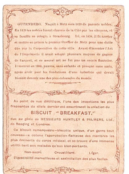 HUNTLEY & PALMERS BISCUITS IN FRANCE IN 1900 IT FEATURES ' INVENTORS - JOHANN GUTENBERG (THE MAIN TEXT IS IN FRENCH)