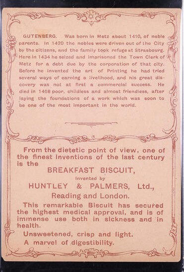 HUNTLEY & PALMERS - INVENTORS CARD - JOHANN GUTENBERG - 1900