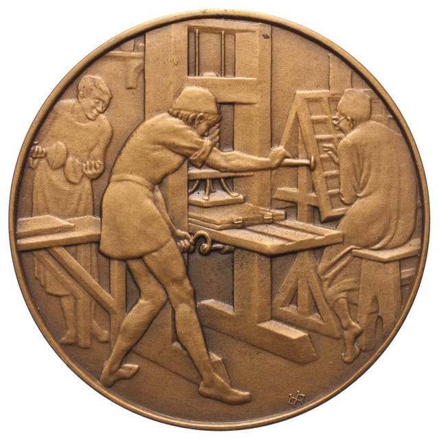 Obverse feature a group of people working the printing press, with a calendar in the background and a beaded circle along the border.