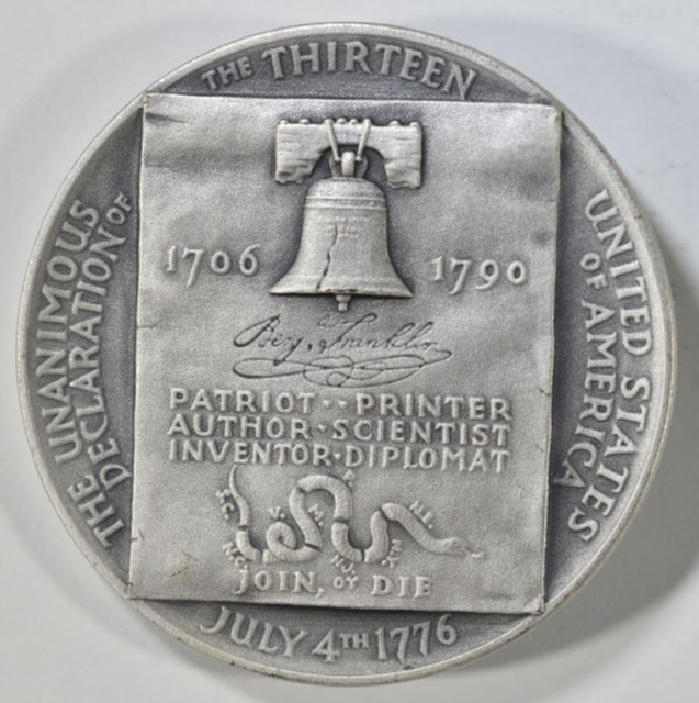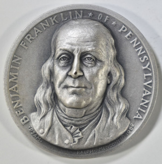 Medal from 1962. Commemorates Benjamin Franklin, mentioning he was a Patriot, Printer, Author, Scientist, Inventor and Diplomat.
