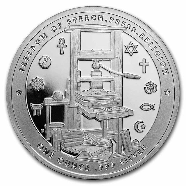 The obverse of the coin features the likeness of Benjamin Franklin, facing right. It is depicted against a plain background. At the bottom is the figure's name. The reverse depicts an ancient printing press, which Franklin used as a printer in his youth. Around it are the symbols of nine world religions. At the top is the inscription "Freedom of Speech, Press, and Religion." At the bottom is the weight and fineness of the metal from which the coin is made.