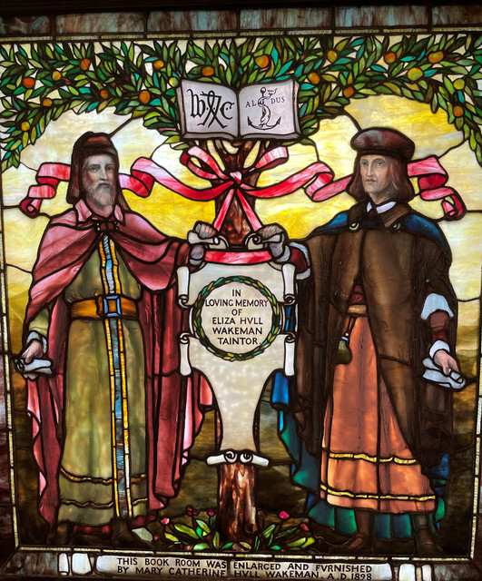 Stained glass, by Tiffany, of William Caxton and Aldus Manutius. Shows printers device. Pequot Library, Southport
